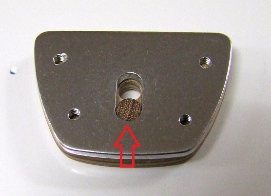 右画像:ストラップピンはまっすぐにしっかり取り付けできるように自作の専用のワッシャーを介して取り付けすることで解決。ストラップピンの下(矢印の箇所)の白っぽいパーツが専用ワッシャー。この部分のストラップピン取り付けはBigsbyのプレートの厚みがあるため、ストラップピン自体は穴にしっかり収まる場合でも、ストラップピンが穴に埋もれすぎてしまってストラップピンが取り付けできない、取り付けしにくい、あるいはストラップがやけに外れやすいという事象もあるかと思います。当店でもそういったご相談を受け対処したことがありました。その際も似たような専用ワッシャーを制作して取り付けることで解決しています。今回の処置にあたって、元々取り付けられていたシャーラーのピンはネジの変形などもあったため再利用は見送り、改めてESPのロックピンを採用しました。