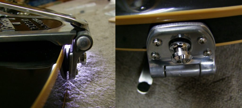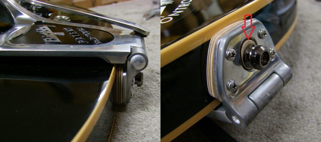 右画像:本機の持ち主様はストラップピンをシャーラーのロック式に交換していましたが、このピンはBigsbyのストラップピン取り付け部の穴に収まらないサイズです。前述の通り取り付け部のプレートがボディから斜めに浮いている状態に加えてストラップピンの形状も合わないためか、ピンが傾いてしまっています。しばらくはこのまま使用していたそうなのですが、無理な固定状態だったためかストラップピンをとめているビスは曲がってしまっていました。この状態でストラップをかけるとストラップがしっくりこないのは勿論ですが、ボディ側のねじ穴にも偏った力がかかってしまい、そのままほっておくとねじ穴が過度に広がって緩んでしまいます。