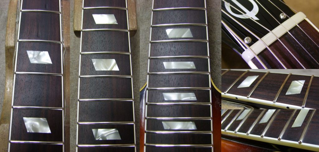 新しく打ち換えたフレットは汎用性の高い国産ナローハイ~ミディアムタイプ(三晃SBB214H、高さ1.3mm×幅2.4mm)。同時に交換したナットは一般的な牛骨よりも密度の高いラクダ骨から削り出しで制作しました。フレット交換の際に指板修正(指板面の面修正)を実施していて綺麗な指板になっていますが、ローポジションには押弦によるえぐれが残っています。