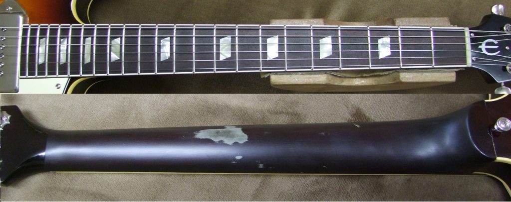 Gibson系のギターはごついネックの印象がありますが日本製CASINOは比較的スリムなネックが多いように思います。本機もそうで、ナット幅40mmのナロー仕様、手の小さい女性にもなじみやすいかと思います。今回の出品にあたってフレット交換も行っており新品以上の演奏性も確保しています。ネック裏は何らかの補修痕と思われる箇所があるものの、サンディングによるサテン処理も加えられており手触りは大変良好、これも弾きやすさに寄与しています。
