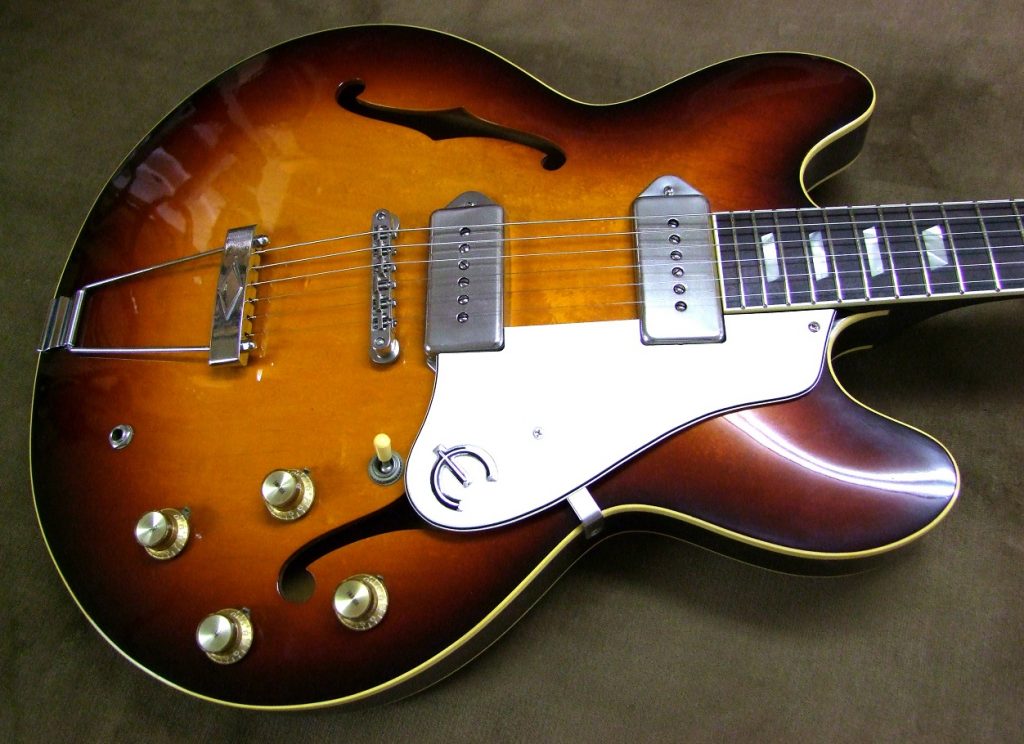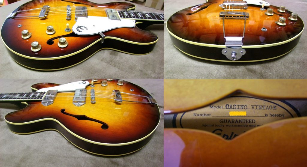日本製のepiphone CASINO VINTAGE1991年製です。後年の日本製(Elitist CASINO)に比べてヴィンテージによせた仕様が特徴となっており国産CASINOの中では人気の機種ではないでしょうか。市場に出てくる数は非常に少なく状態が保たれた上で演奏性もしっかり確保できている個体はなかなかの掘り出し物かもしれません。