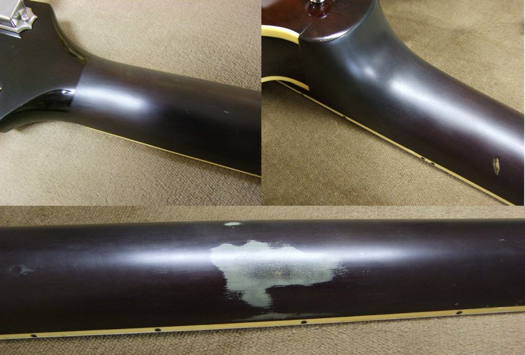 全体的な拭き傷や弦交換に際して付きやすい傷があること、ネック裏の補修痕(詳細後述)や小打痕も散見されそれなりの使用感があるものの、それもヴィンテージらしさにつながるのではないかと思います。